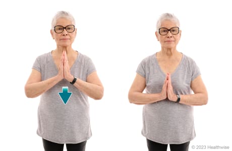 - Slowly lower your hands toward your waistline, keeping your hands close to your stomach and your palms together. You will feel a mild to medium stretch under your forearms.