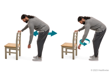 - Hold on to a table or the back of a chair with your unaffected arm. Then bend forward a little and let your affected arm hang straight down. This exercise does not use the arm muscles. Rather, use your legs and your hips to create movement that makes your arm swing freely.