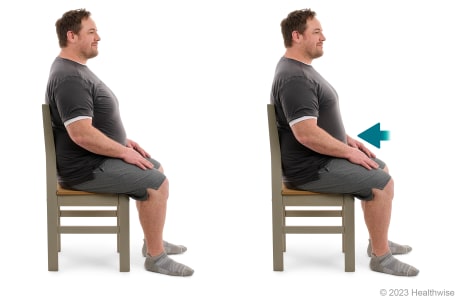 - Pull in your belly and imagine pulling your belly button back toward your spine. (Remember to keep a neutral spine while you do this, and don't let your back bend forward. Neutral spine is the name for posture that maintains the three normal curves in your spine.)